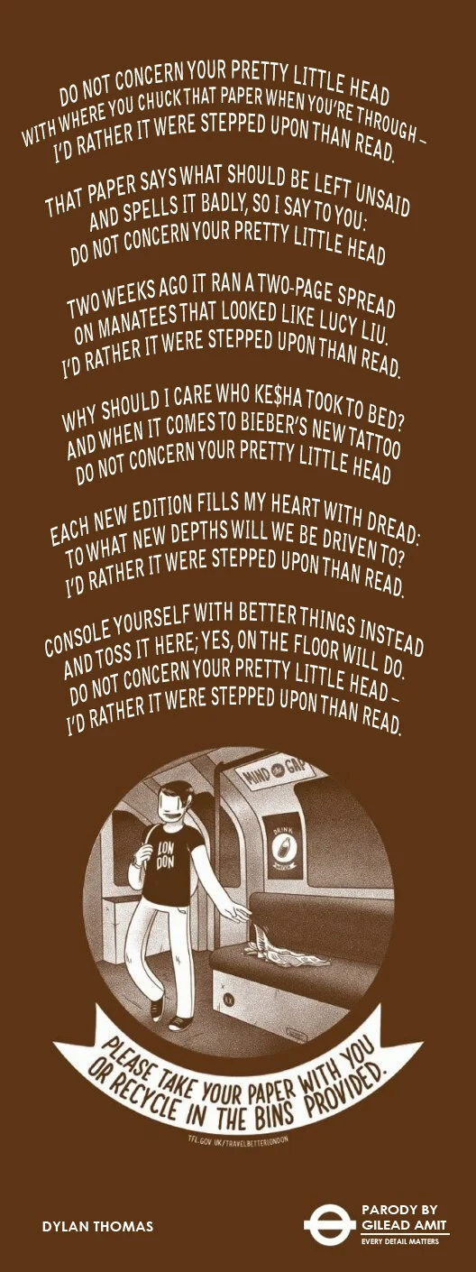 Insipid rhymes such as these are now displayed on the same tube carriages which in previous years did so much for literary education with the fantastic ‘poetry on the underground’ campaign. TfL really seem to be missing a trick on this one.e: